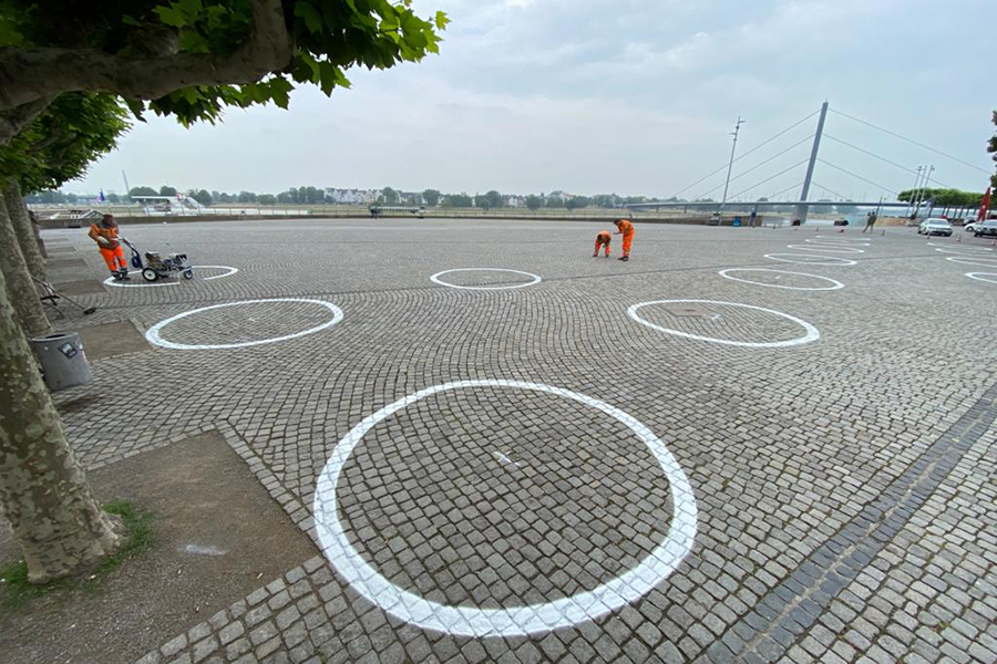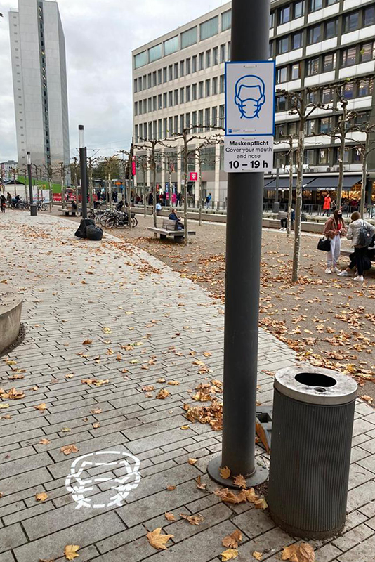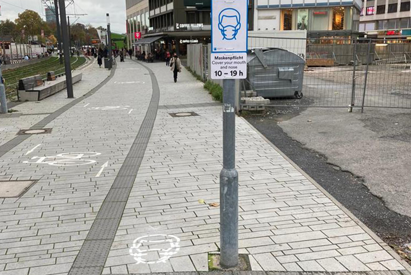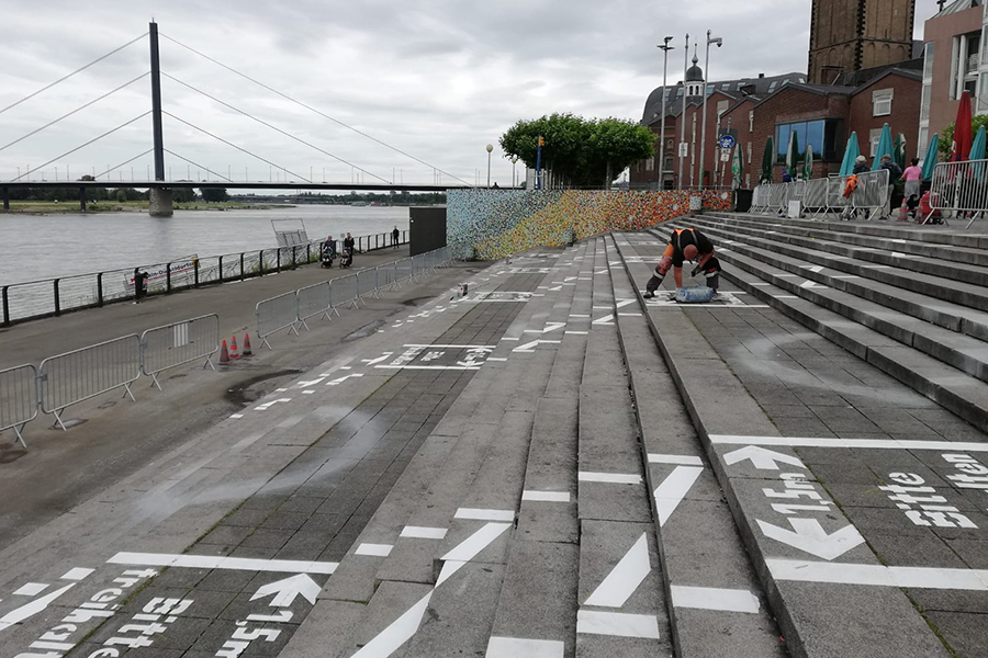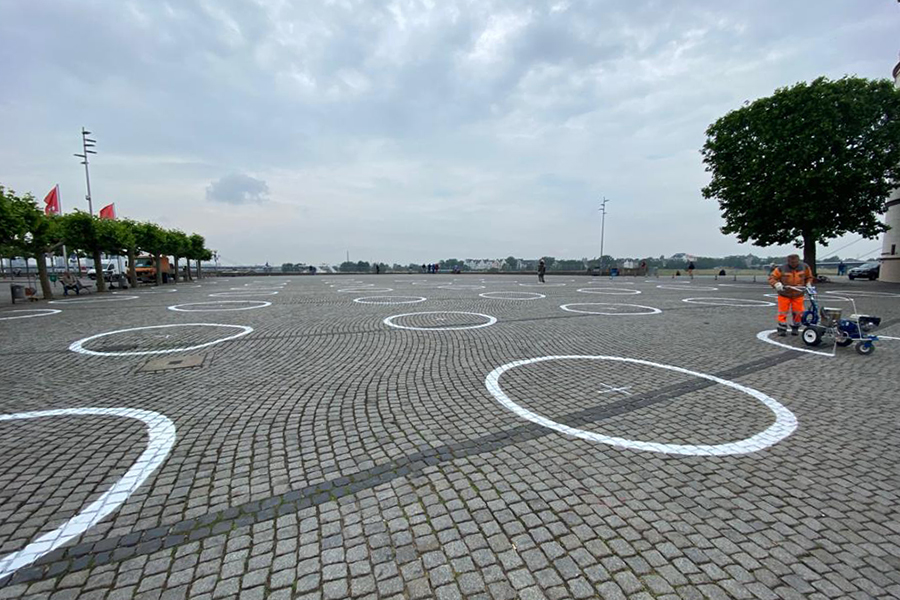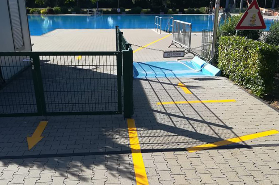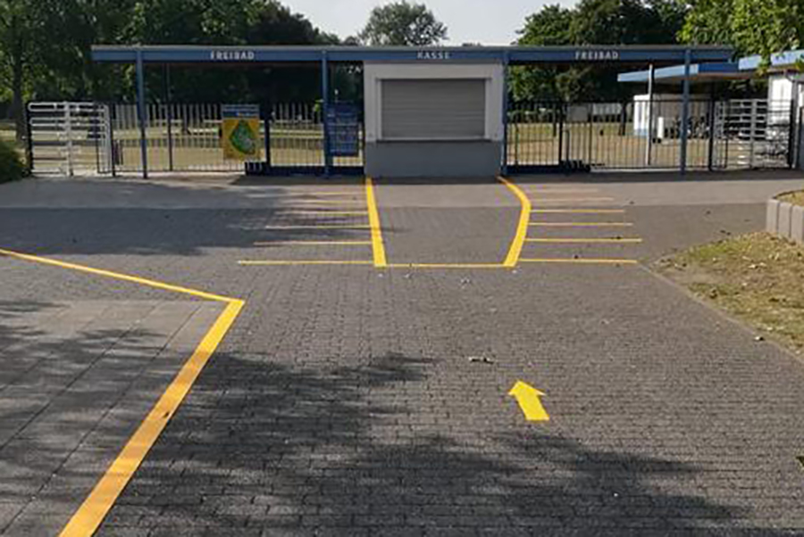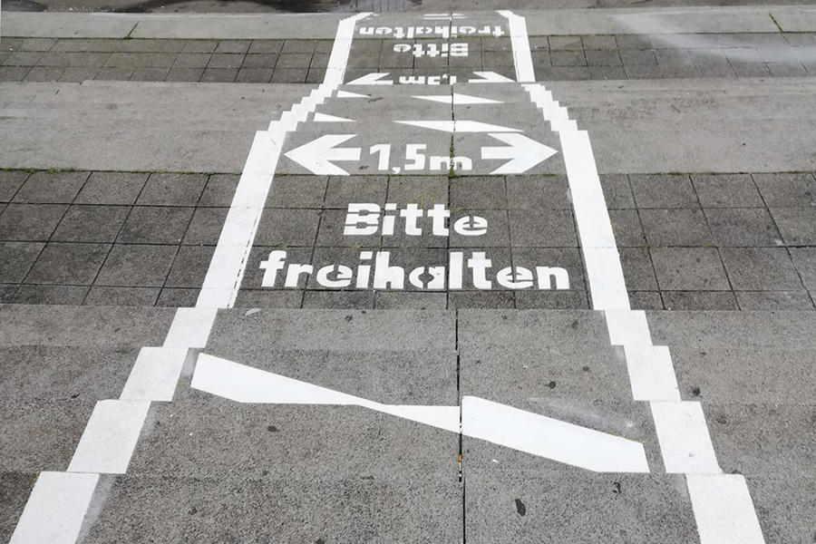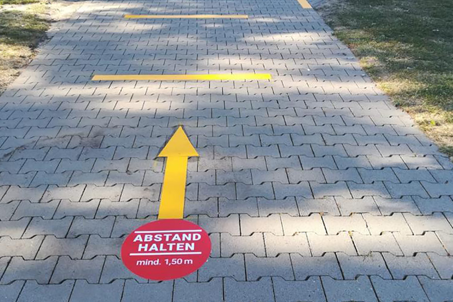 Besucherführung für Betriebe unter Coronaschutzmassnahmen und Signalisierung von vorgegebenen Mindestabständen und maskenpflichtigen Zonen zur Eindämmung von COVID-19.