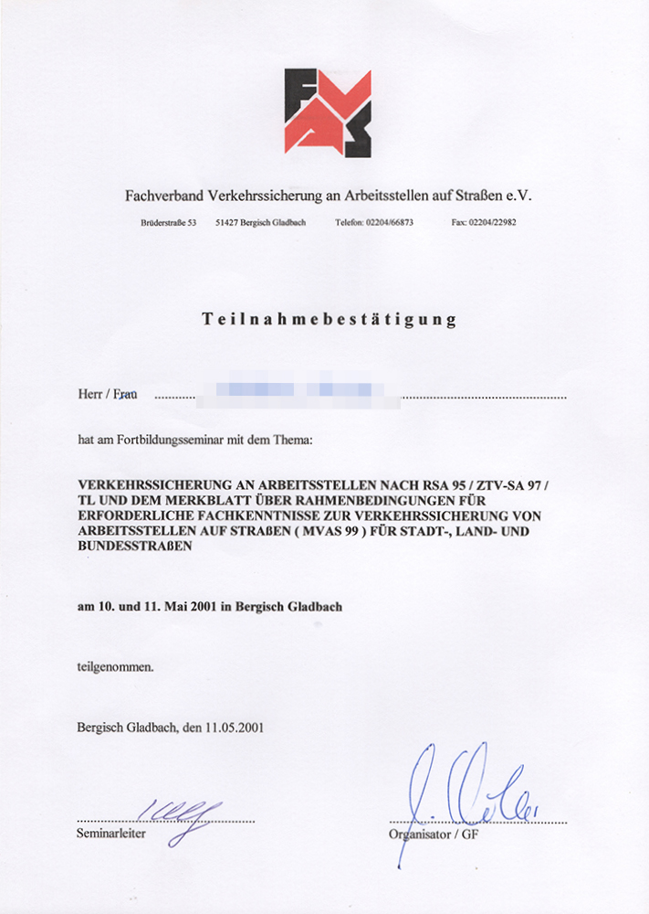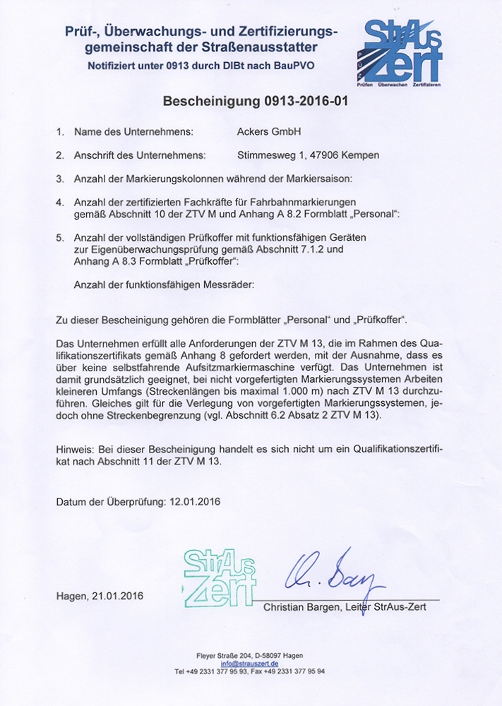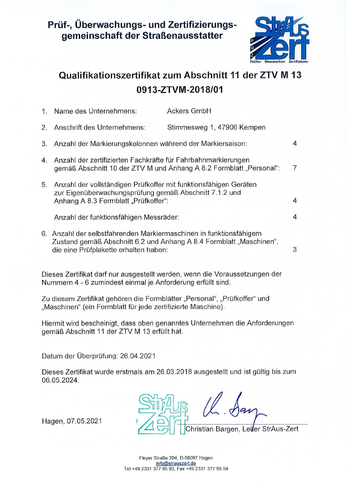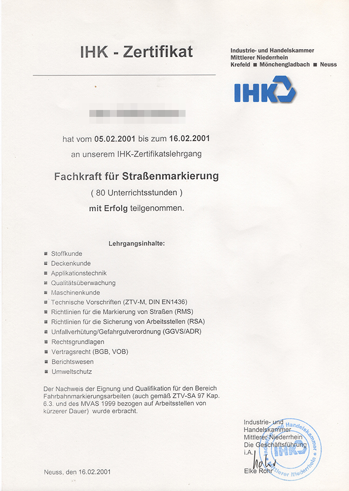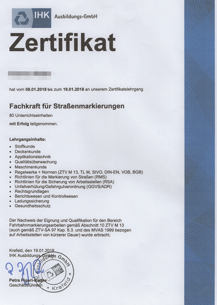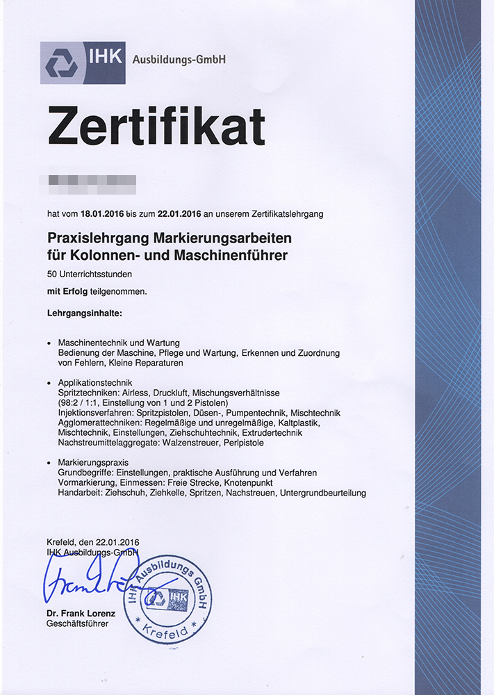 Unsere Kolonnen bestehen aus qualifizierten ausgebildeten Handwerkern (HWK / IHK), die alle zusätzlich die Prüfung zur Fachkraft für Straßenmarkierungen (IHK), so wie einige zum Maschinen- & Kolonnenführer (IHK), abgelegt haben. Für uns ist es besonders wichtig, dass unsere Mitarbeiter nach neuesten Vorgaben geschult sind und regelmäßig Fortbildungen besuchen.